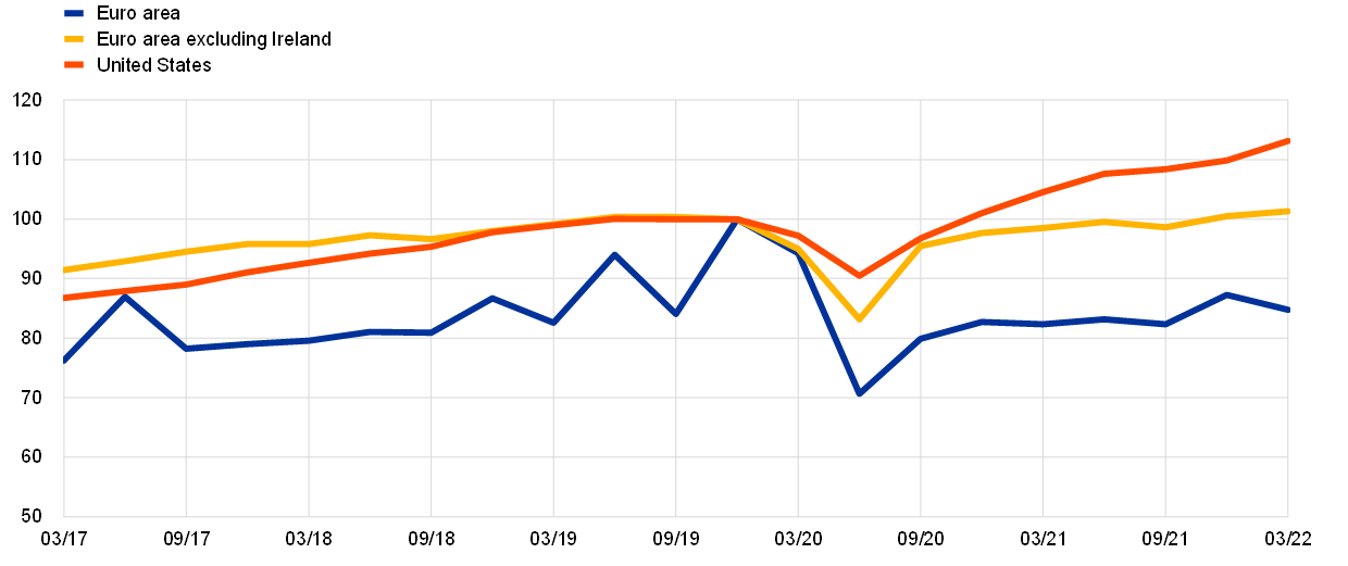 There are several factors behind the euro area’s slower recovery in investment. First, the pandemic began somewhat earlier in Europe than in the United States, and lockdown measures in the spring of 2020 were stricter and more protracted, resulting in less bad outcomes in terms of health but a larger contraction of economic activity and investment, as well as stronger headwinds for the recovery.[7] Second, and more importantly, euro area investment patterns have been more volatile than in the United States, reflecting irregular inflows of intangible investment by US multinationals, particularly for Ireland. By far the largest inflow to date occurred in the final quarter of 2019, artificially boosting the yardstick by which the subsequent recovery would be measured.[8] Adjusting for this starting level (Chart A, panel a), the euro area recovery is closer to the profile in the United States, albeit merely edging back to pre-crisis levels by mid-2021. This evolution is common across asset types, with a gap having built up between the euro area and the United States both for machinery and equipment and for intellectual property products (Chart A, panel b).