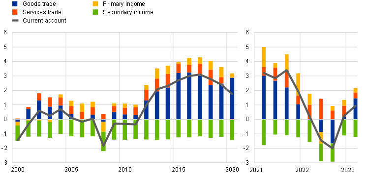 In 2022 the euro area current account balance recorded a deficit of 0.8% of euro area GDP compared with a surplus of 2.8% in 2021 – a deterioration of 3.6 percentage points.[1] This constituted the biggest annual change in the euro area current account balance on record as the terms-of-trade shock from rising energy prices following Russia’s invasion of Ukraine triggered a substantial worsening of the euro area trade balance.[2] Since the introduction of the euro in 1999, the euro area current account balance has been through several distinct phases. After being in deficit in the early 2000s, it maintained a roughly balanced position until the global financial crisis, when it sharply deteriorated to reach a historically high deficit of close to 2% of GDP in 2008. Following a period of consolidation, the euro area current account balance then recorded sustained surpluses between 2013 and 2019, before exhibiting some pandemic-induced volatility already in 2020 and 2021.[3]