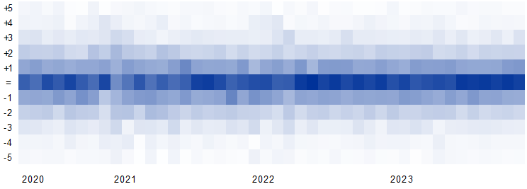 Notes: Weighted CES estimates covering monthly survey waves from April 2020 to December 2023. The cell shading reflects the share of respondents in a given survey wave (month) that changed their trust in the ECB vis-à-vis the previous month by the amount shown on the scale. A darker shade represents a larger share of respondents – for example, the highest share is seen in June 2022, when 38% of respondents reported an unchanged level of trust relative to the previous survey wave (month). For simplicity, month‑on‑month changes greater than +5 or -5 are not shown, as they reflect less than 5% of respondents in each wave. To avoid tenure effects, the chart is based on respondents completing the survey for a second (consecutive) time.