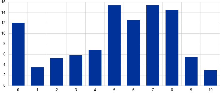A significant majority of survey respondents express either some trust or a high level of trust in the ECB, with those expressing a complete lack of trust remaining a relatively small group. The CES questionnaire informs respondents that a score of 10 means complete trust in the institution, while a score of 0 means no trust in the institution at all.[13] In practice, each respondent may attach their own interpretation to the different values on the scale. For example, an individual’s score of 0 might mean a complete absence of trust, but it could also reflect active distrust (“negative trust”). In fact, the relatively high share of respondents with a trust level of 0, relative to the trust level of 1, suggests that individual scores of 0 reflect more than one underlying sentiment. Thus, the distribution of trust levels is potentially left‑censored. Several studies point out that the concept of distrust is not the same as the absence of trust and that distrust might imply greater familiarity with what is being judged.[14]
