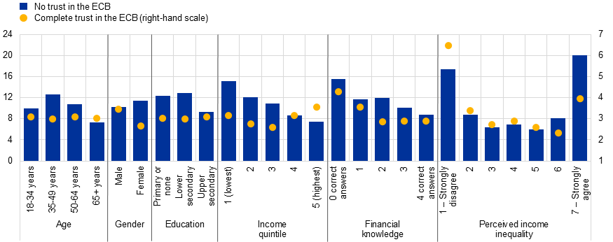 As regards age, the share of individuals with complete trust in the ECB is broadly stable across age groups, while the share of respondents with no trust in the ECB is particularly high in the 35-49 age group and smallest in the 65 and above age group.[20]