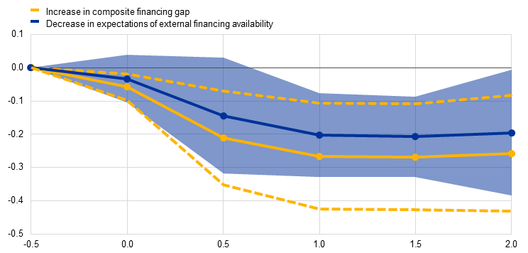 Following a 1 percentage point increase in the composite financing gap, real GDP in the euro area declines, on average, by 0.3% over the subsequent year (Chart 6). This decline is constant over the next 18 months but becomes less significant after two years. Conversely, following a decrease of 1 percentage point in the expected availability of external financing, real GDP in the euro area declines, on average, by approximately 0.2% over the subsequent year. These estimates are conditional on lagged real GDP growth, thus exploiting the information from the survey beyond past observable developments in the business cycle.