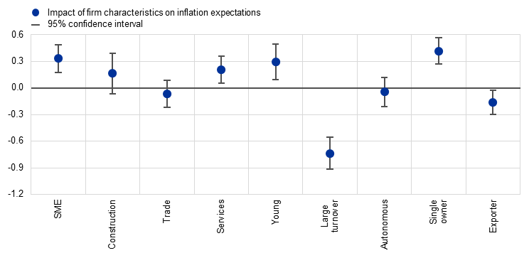 Notes: Panel a) shows survey-weighted median firms’ expectations for euro area inflation in one year, three years’ and five years’ time. Panel b) shows the relationship between firm characteristics and one-year ahead inflation expectations. Robust standard errors are considered for the 95% confidence intervals.