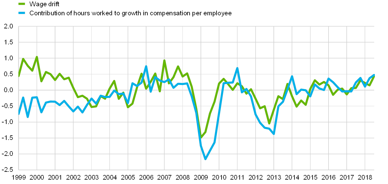 Wage drift was the main driver of higher wage growth during the early phase of wage growth strengthening, but is now also supported by negotiated wages. From the second quarter of 2016 to the fourth quarter of 2017, the 0.4 percentage point change in the wage drift was the largest single contribution to the increase in the growth of compensation per employee, which rose from 1.0% to 1.8% (see Chart A). Over that period growth in negotiated wages was largely flat, only starting to pick up in 2018, when it increased from 1.5% in the last quarter of 2017 to 2.1% in the third quarter of 2018.The recent increase in compensation per employee growth from 1.9% in the fourth quarter of 2017 to 2.5% in the third quarter of 2018 was hence strongly supported also by growth in negotiated wages.