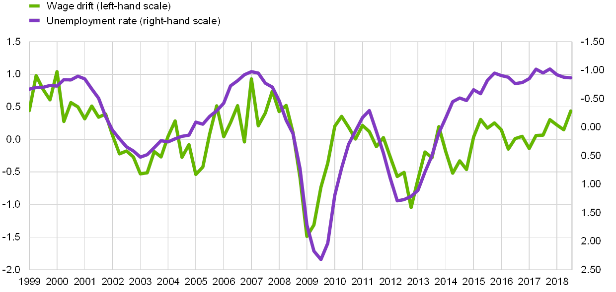 The wage drift measures deviations between developments in actual wages and developments in negotiated wages. It is an important element in the macroeconomic analysis of employee compensation because it should be closely linked to cyclical developments in the labour market. In a tightening labour market, employers might be compelled to offer pay scales that are higher than those under collective agreements, to promote employees to higher bands within collectively agreed pay scales, or simply to pay bonuses on top of agreed wages as a way to reward and retain employees. Given recent protracted declines in unemployment and increasing signs of labour shortages, this box reviews the role of the wage drift in recent developments in employee compensation.