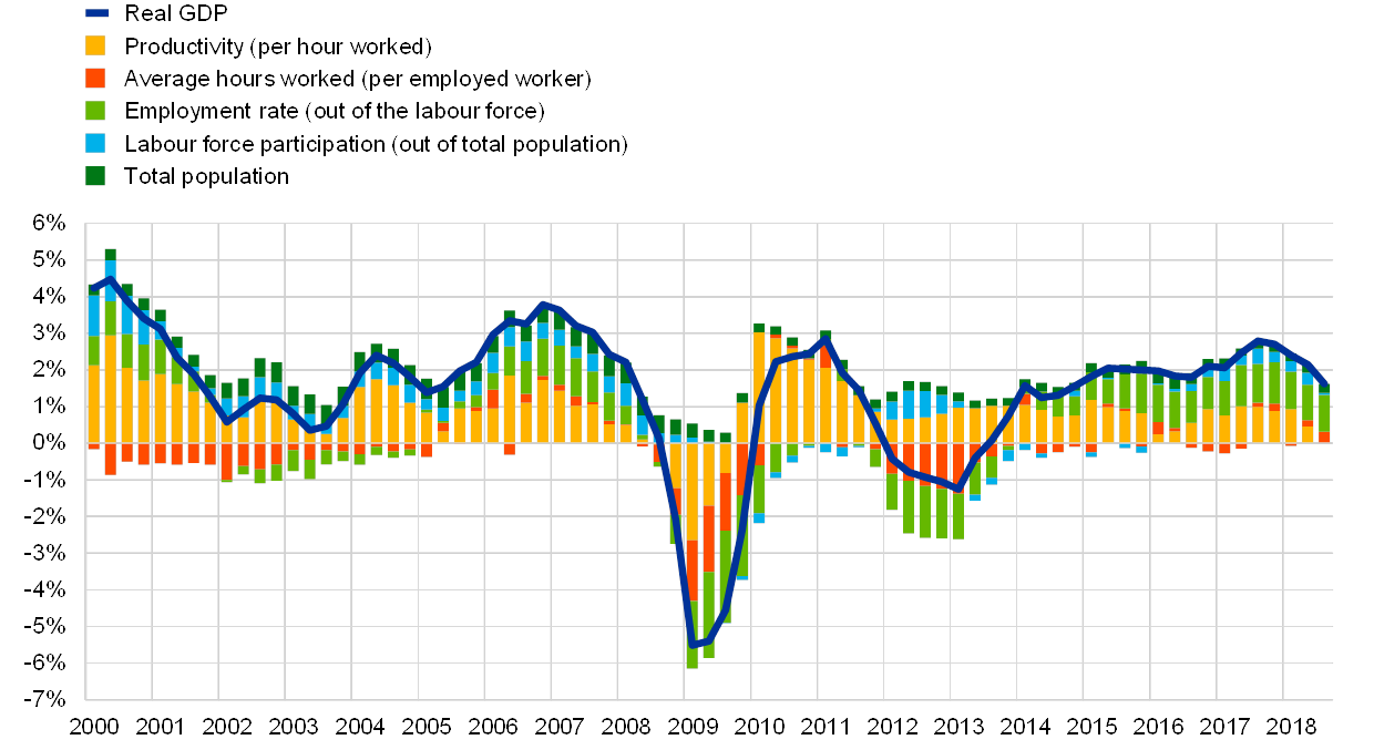 This box analyses developments in the euro area labour market with respect to recent changes in GDP growth. The labour market remained relatively robust throughout 2018, in spite of the slowdown in real GDP growth. A decomposition of GDP into labour productivity, labour market outcomes and demographic trends shows a larger contribution to real GDP growth from employment (see Chart A). In the first three quarters of 2018, economic growth was strongly supported by employment growth and by the stable decline in the unemployment rate. These developments contrast sharply with trends during the early period of the recovery and highlight the strength of the labour market in the euro area against the background of the slowdown in GDP growth in 2018. Indeed, despite the considerable heterogeneity observed across different euro area countries, the aggregate euro area unemployment rate was, in December 2018, at its lowest since October 2008, with the employment-to-population ratio higher than in 2008[1].
