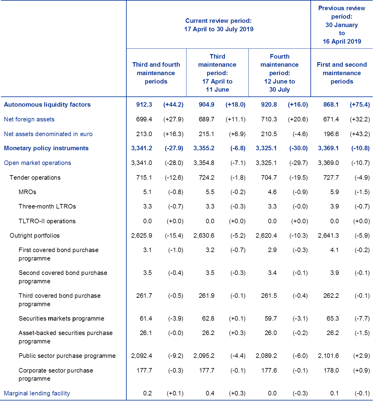 This box describes the Eurosystem liquidity conditions and the ECB’s monetary policy operations during the third and fourth reserve maintenance periods of 2019, which ran from 17 April to 11 June 2019 and from 12 June to 30 July 2019, respectively. Throughout this period the interest rates on the main refinancing operations (MROs), the marginal lending facility and the deposit facility remained unchanged at 0.00%, 0.25% and -0.40% respectively. In parallel, the Eurosystem continued the reinvestment phase of its asset purchase programme (APP), reinvesting principal payments from maturing public sector securities, covered bonds, asset-backed securities and corporate sector securities.