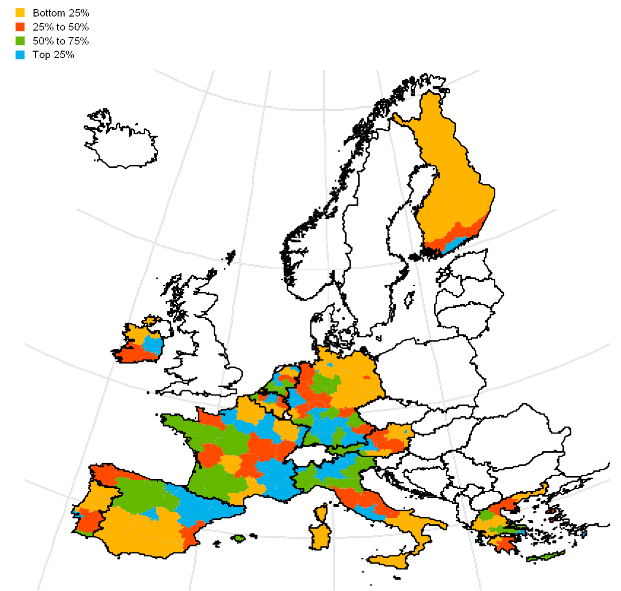 2. The results are not driven by the assignment of regions to the different quartiles of their within-country GDP per capita distribution in 2007, as the results of the analysis described in this box still hold when regions are grouped by the euro area GDP per capita distribution in 2007, or when a single country is removed from the analysis.