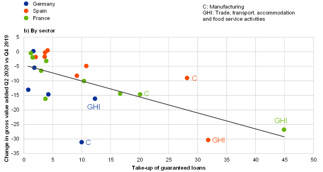 SMEs in the sectors that are most affected by the crisis (e.g. trade, tourism and transport) seem to have benefited the most from public loan guarantee schemes. The take-up of guaranteed loans has been significantly higher for SMEs and the self-employed than for large firms, except in Germany (see Chart B, panel a). The higher take-up by SMEs reflects their relatively greater emergency liquidity needs, their greater dependence on banks for financing and the fact that there are fewer bottlenecks in the banking sector affecting the provision of guaranteed loans for smaller amounts. In particular, while the amount of the take-up is relatively low in Italy, the highest number of guaranteed loans have been granted in this country, reflecting the predominance of very small loans. From a sectoral perspective, the take-up of guaranteed loans has been highest in the sectors hardest hit by COVID-19-related concerns about physical contact, and the concomitant lockdown policies, resulting in a sharp decline in their gross value added in the first half of 2020, with trade, transport and food services accounting for the highest take-up, followed by manufacturing (see Chart B, panel b).