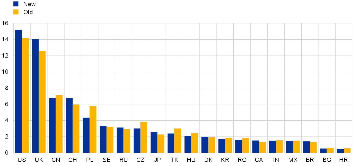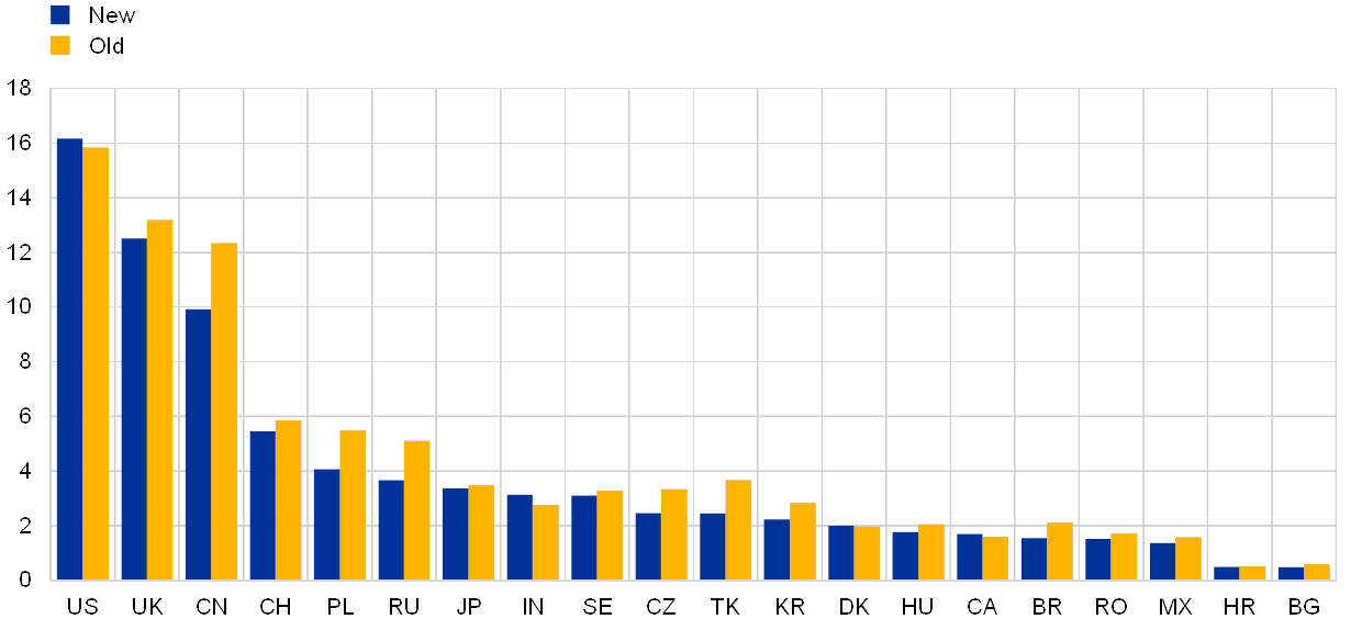 The inclusion of trade in services for the purposes of calculating the country weights reshuffled the weights of the euro area’s key trading partners. More specifically, the share of the United States and the United Kingdom has increased further so that together they account for 29.2% of the euro area’s foreign demand (see Chart A). Also, Switzerland now accounts for a similar share of euro area foreign demand to China, which by contrast has seen a slight decline in its weight compared to previous values. The weights have fallen for a number of countries, including Poland, the Czech Republic and Turkey, which are important euro area trading partners, but where bilateral trade in goods is greater than trade in services.