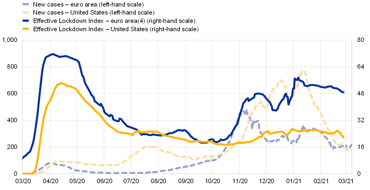Notes: Goldman Sachs’ Effective Lockdown Index (ELI) is a combination of the Oxford COVID-19 Government Stringency Index and Google Mobility data. The latest observations are for 7 March 2021 for new COVID-19 cases and 26 February 2021 for the Effective Lockdown Index. Euro area(4) refers to the PPP-weighted indices for Germany, France, Italy and Spain.