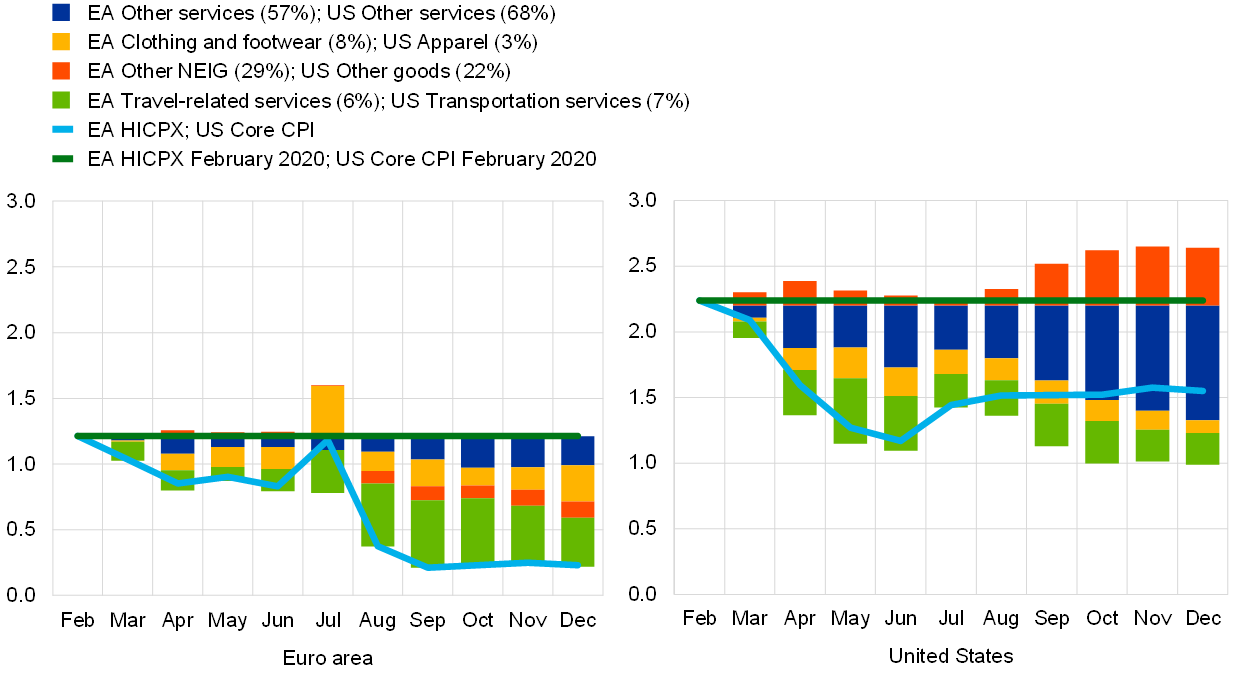 Notes: Shares in the underlying basket are given in brackets. For the euro area, HICPX stands for the HICP excluding energy and food. For the United States, the core CPI excludes food and energy prices. The latest observations are for December 2020.