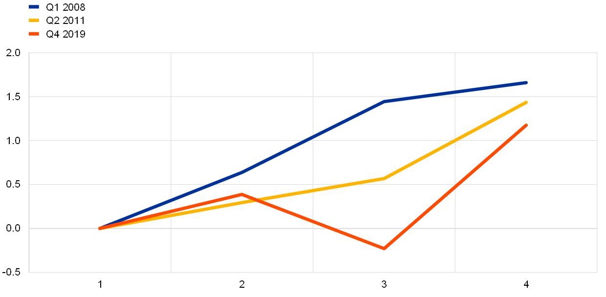 Notes: The chart shows the cumulated changes in consumption of fixed capital per unit of value added, where the first quarter preceding the recession is set equal to one. The quarter preceding the recession is displayed in the legend. Due to the volatility of some series or the absence of data in some countries, this chart represents the overall change observed in Germany, France, Italy and Spain.
