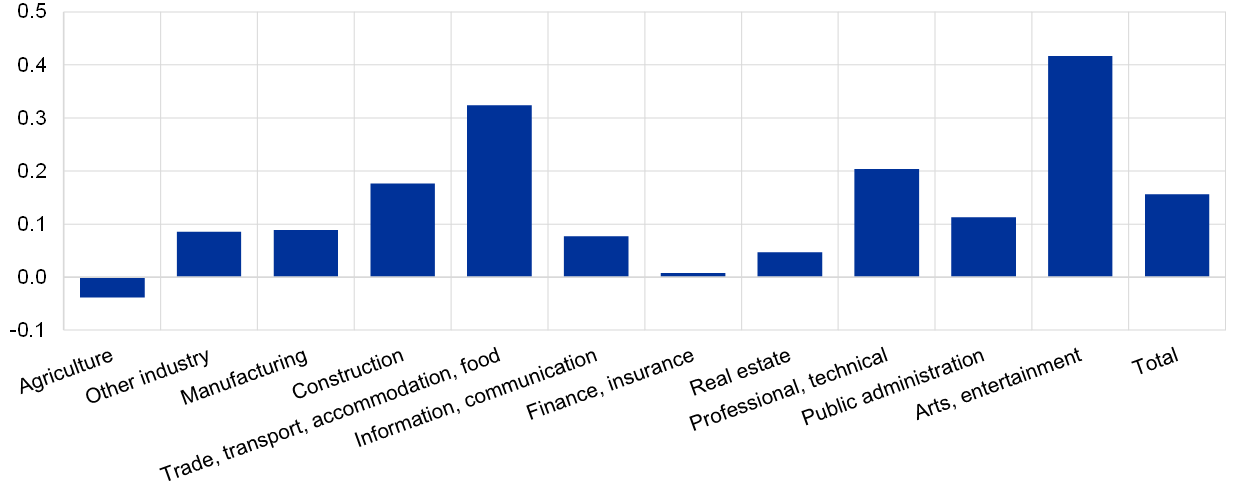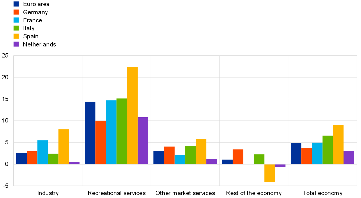 Note: Industry includes the NACE Rev. 2 classification sectors B, C, D, E and F; recreational services includes G, H, I, R, S, T and U; other market services includes J, K, L, M and N; rest of the economy includes A, O, P and Q; and total economy refers to real GDP.