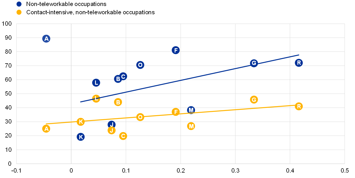 Notes: The reported sector elasticities are estimated with the constant-parameter cross-sector VAR model. One-letter labels refer to the following sectors: agriculture (A); other industry (B); manufacturing (C); construction (F); trade, transport, accommodation and food (G); information and communication (J); finance and insurance (K); real estate (L); professional and technical (M); public administration (O); and arts and entertainment (R). Granular data on occupations are based on the O*NET dataset (see O*NET OnLine, National Center for O*NET Development, 2020). The index of non-teleworkable occupations is constructed as 100 minus the index of teleworkable occupations in Dingel, J. and Neiman, B., op. cit. The index of contact-intensive, non-teleworkable occupations is produced by Koren, M. and Pető, R., op. cit., by combining an index of non-teleworkable occupations with a composite index of face-to-face teamwork, customer interactions, physical presence and communication. These granular data are aggregated into the 11 sectors based on value-added weights for NACE Rev. 2, two-digit level branches from the World Input-Output Database 2014 data for the euro area. The solid blue line corresponds to the trend between the sector elasticities and non-teleworkable occupations for all sectors excluding agriculture. The solid yellow line corresponds to the trend between the sector elasticities and contact-intensive, non-teleworkable occupations for all sectors.