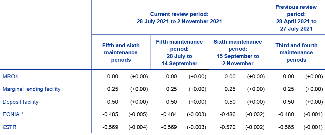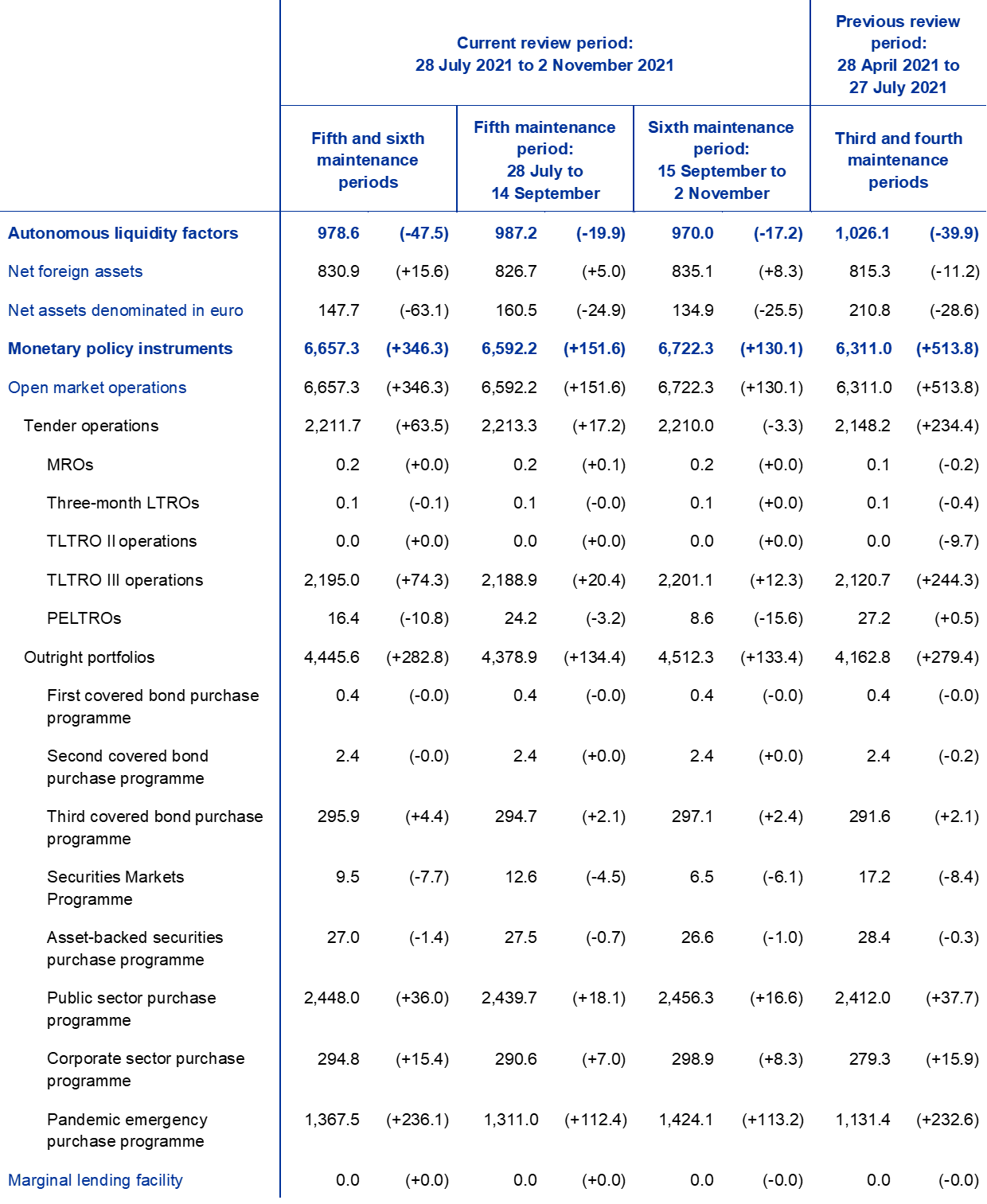 This box describes the ECB’s monetary policy operations and liquidity developments during the fifth and sixth reserve maintenance periods of 2021. Together, these two maintenance periods ran from 28 July to 2 November 2021 (the “review period”).