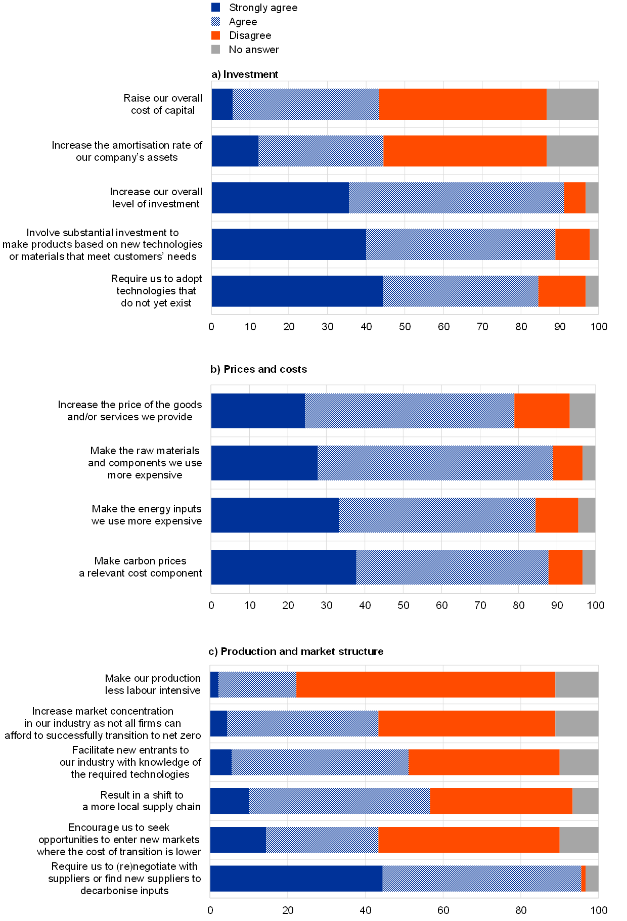 A majority of respondents agreed that transitioning to a net-zero economy would require higher investment, raise costs and increase their firm’s selling prices (Chart C). 80% or more agreed that mitigating climate change would require their firms to adopt technologies that did not yet exist, that substantial investment was needed to make products based on new technologies or materials to meet customers’ needs and that the overall level of investment would increase due to efforts to mitigate climate change. A somewhat lower share, however, thought that climate change would increase the cost of capital or raise the amortisation rate on their company’s assets. 80% or more of respondents agreed that mitigating climate change would make the raw materials and components they use more expensive, carbon prices into a relevant cost component and the energy they use more expensive. Almost as many agreed that this would increase the price of the goods and/or services their company provides.