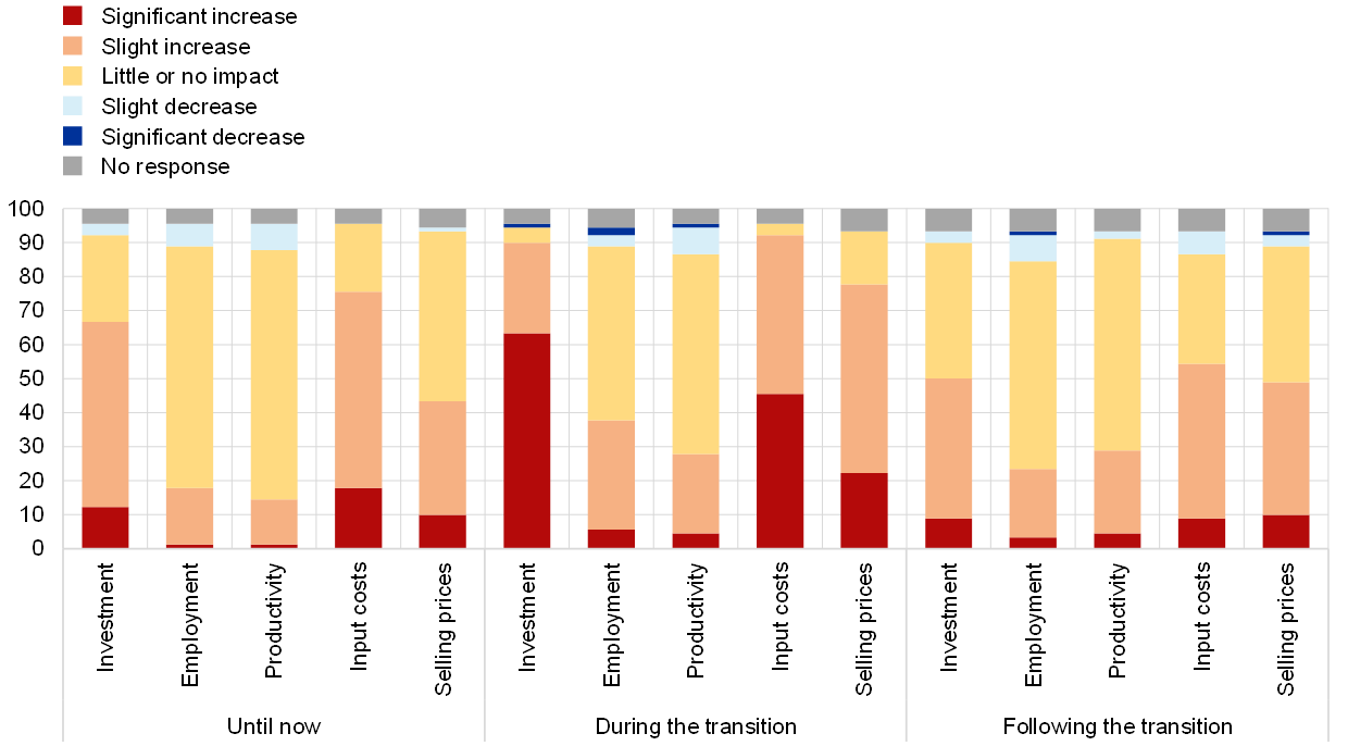 Only a small share of respondents expected a significant increase in investment, costs and prices due to climate change after the transition (Chart D). This suggests firms anticipate that much – but not all – of the impact on investment, costs and prices will be limited to the transition period itself. Specifically, more than half of respondents thought that investment, costs and prices would be structurally higher after the transition, but only a small share (around 10%) expected them to be significantly higher. Furthermore, the results suggest that the overall upward impact on investment and costs after the transition is expected, on average, to be slightly lower than it has been until now. By contrast, the upward impact on selling prices is expected to be slightly higher.