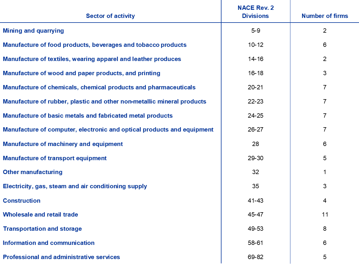 2. The survey of leading firms took place in the context of the ECB’s dialogue with non-financial companies as a special survey in addition to the regular survey rounds. The regular survey is described in “The ECB’s dialogue with non-financial companies”, Economic Bulletin, Issue 1, ECB, Frankfurt am Main, 2021.