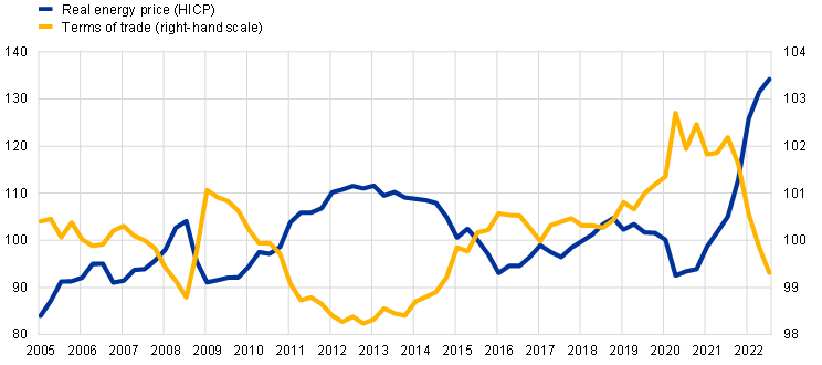 The terms of trade can also be affected by other factors (e.g. the nominal exchange rate, the prices of goods and services other than energy). Empirically, however, most of the variation in the euro area terms of trade is explained by energy prices. For a breakdown of the dynamics of household real disposable income into different sources of income and the terms of trade in periods when energy prices fluctuate sharply, see the article entitled “Energy prices and private consumption: what are the channels?”, Economic Bulletin, Issue 3, ECB, 2022.