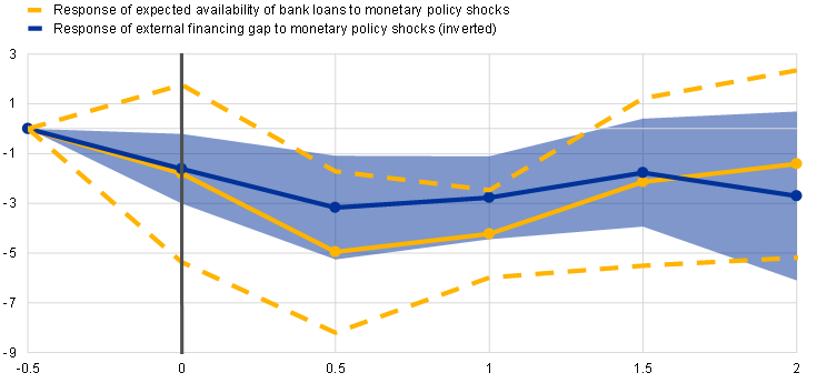 Notes: Response of firms’ financing gaps and the net percentage of firms reporting an expected increase in the availability of bank loans over the next six months after a one-standard-deviation monetary policy shock. The shock used is the target factor from Altavilla et al. (2019), capturing monetary policy surprises in the very short end of the OIS curve in and around ECB monetary policy announcements. The effect of the monetary policy shocks on SAFE variables are estimated using local projections (Jorda, 2005). The shaded and dotted areas are 95% confidence bands based on Newey-West.