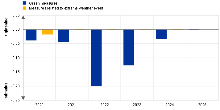 Green fiscal measures provide a modest fiscal stimulus. This can be seen in the December 2022 projections baseline, where the modest fiscal stimulus is strongest in 2022 (Chart A). Current fiscal measures related to extreme weather events are expected to have a marginal effect in the euro area as a whole over the projection horizon. However, their effect is larger in countries that have recently been hit by extreme weather events, such as the 2021 floods in Belgium, Germany, Luxembourg and the Netherlands.[4] The climate impact of green fiscal measures is not necessarily proportional to the macroeconomic impact, as some measures might mitigate climate change more effectively than others. In addition, some measures offset the macroeconomic impact of others, for example when an increase in carbon taxation is used to finance climate-related expenditures.