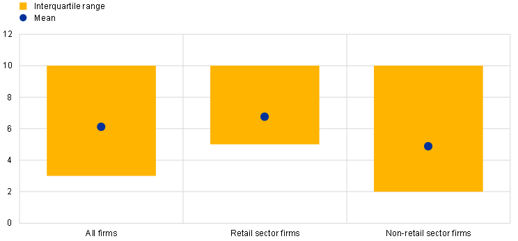 Notes: Average expectations about selling prices for the next 12 months as reported by euro area firms, along with interquartile ranges, using survey weights. The statistics are computed after trimming the data at the country-specific 1st and 99th percentiles. The distribution for “All firms” comprises the replies of all enterprises included in the SAFE (10,983). See the relevant footnote for details on the categorisation of firms as “retail sector” and “non-retail sector” firms. The change in the average expected selling price for the subsample of retail and non-retail sector firms merged with Bureau Van Dijk’s Orbis dataset is 5.6%. The figures refer to the 28th round of the SAFE (October 2022-March 2023).