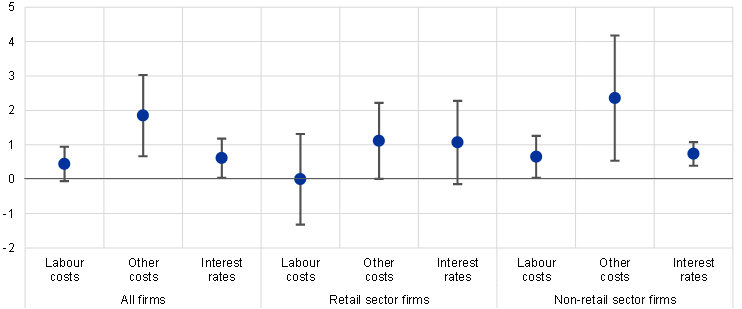Notes: The chart shows coefficients from regressing the change in expected prices on changes in labour costs, other costs (materials and energy) and the level of interest rates. The right-hand side variables in the regression take value 1 if firms indicated an increase in labour costs, other costs or the level of interest rates for the period October 2022-March 2023. The regressions include country and firm-size fixed effects. The whiskers represent 90% confidence intervals based on clustered standard errors by country. See the relevant footnote for details on the categories “All firms”, “Retail sector firms” and “Non-retail sector firms”. The figures refer to the 28th round of the SAFE (October 2022-March 2023).