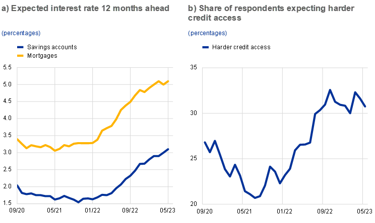 In line with actual interest rate developments, consumers’ expectations for interest rates have increased. Expectations for interest rates on mortgages and savings accounts in 12 months’ time have increased by almost 2.0 percentage points and 1.5 percentage points respectively since the beginning of 2022 (Chart A, panel a). The share of respondents expecting that it will be harder to obtain credit (of any type) increased steadily from the beginning of 2022 until October 2022 and has hovered around 30% since then.