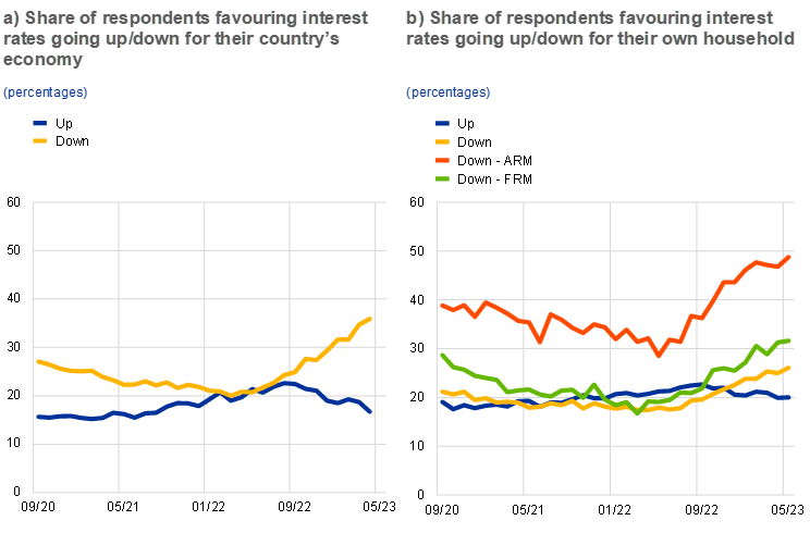 Since June 2022 an increasing share of respondents, particularly among those with an adjustable rate mortgage (ARM), has favoured lower interest rates. In June 2022 the share of respondents reporting that lower interest rates would be best for their country’s economy had already exceeded the share favouring higher interest rates (Chart B, panel a).[2] Similarly, in the autumn of 2022 the share of consumers who thought lower interest rates would be best for their own household exceeded the share reporting that they preferred higher interest rates. The growing preference for lower interest rates is particularly visible among households with an ARM mortgage who are arguably more directly affected by the rise in interest rates. Conversely, households with a fixed rate mortgage (FRM), who are not as exposed – or at least not as immediately – to higher interest rates, have changed their attitudes toward interest rates by much less.