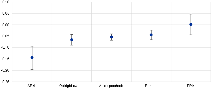 Notes: The dots show the sensitivity of expected consumption to an expected change in mortgage interest rates by type of household. These parameters are estimated in a panel regression of the monthly change in expectations of household real consumption growth one year ahead (nominal consumption growth minus the expected inflation rate 12 months ahead) on the change in expectations of mortgage interest rates that also controls for the expected nominal income growth for the year ahead and unobserved heterogeneity across households. The 95% confidence intervals of the estimated parameters are shown by the vertical whiskers. The estimation period is from April 2020 to May 2023.