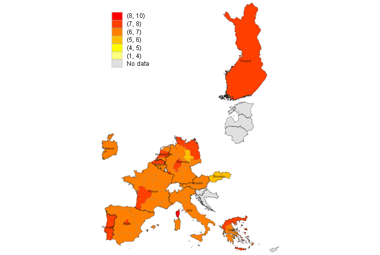 Notes: The maps show the weighted average score for the importance of consequences of climate change for firms over the next five years by main socio-economic regions based on NUTS1 (2016 classification) in the euro area. Firms were asked to indicate how important the consequences of climate change (natural hazards, environmental degradation and stricter climate standards) are for their current business model five years ahead on a scale of 1 (not at all important) to 10 (extremely important). The weighted average scores at NUTS1 level are averages of the responses within each bracket weighted by size class, economic activity and country to reflect the economic structure of the underlying population of firms.