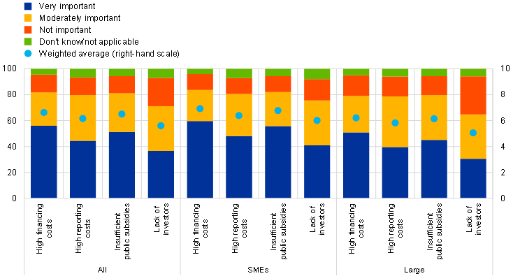 Several obstacles were indicated as hampering access to the financing necessary for investments to mitigate natural hazard risks or comply with stricter climate standards (Chart E). More than half of the firms indicated too high interest rates or financing costs and insufficient public subsidies as being very important obstacles to securing climate-related investment.[8] Firms may consider the costs to be high as they might not be sufficiently internalising the benefits of addressing climate change risks. Too high environmental reporting costs were also quoted as a very important obstacle by 45% of firms, whereas 37% of firms considered the lack of investors’ willingness to finance green investment a very important concern. For SMEs, all obstacles to securing financing for investment are of greater concern than for large firms.