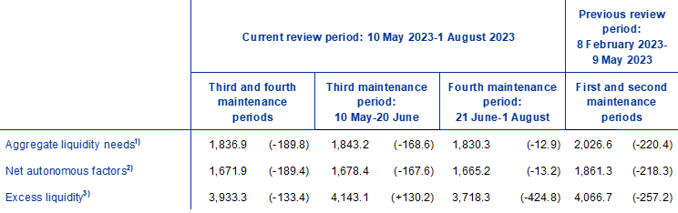 This box describes liquidity conditions and the Eurosystem’s monetary policy operations during the third and fourth reserve maintenance periods of 2023. Together, these two maintenance periods ran from 10 May to 1 August 2023 (the “review period”).