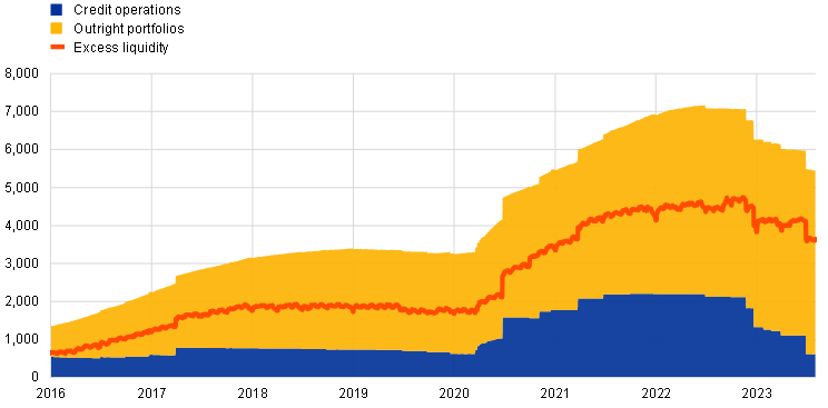 Excess liquidity decreased by €467.8 billion from €4,114 billion on the last day of the previous review period, to stand at €3,646.1 billion on 1 August, the last day of the current review period. Average excess liquidity fell by €133.4 billion over the review period, to stand at €3,933.3 billion. Excess liquidity is the sum of banks’ reserves above the reserve requirements and the recourse to the deposit facility net of the recourse to the marginal lending facility. It reflects the difference between the total liquidity provided to the banking system and banks’ liquidity needs. After peaking at €4,748 billion in November 2022, excess liquidity has progressively decreased, mainly as a result of maturing operations and early repayments under TLTRO III, net of the effects of autonomous factors.