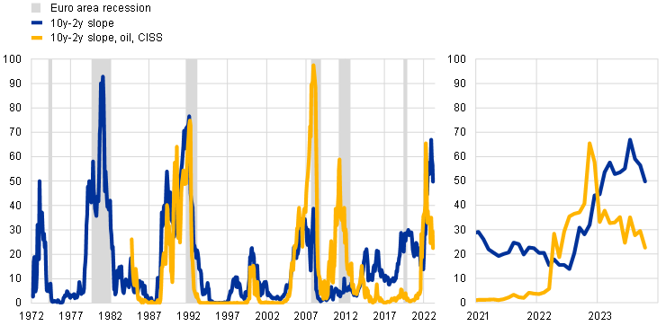 Another caveat at the present juncture is the fact that the negative nominal slope is currently driven by the real yield curve, which might weaken the signal of the simple model. Understanding why the yield curve slope is informative with regard to recession risks is challenging, as the slope contains information about monetary policy expectations, risks and views on the macroeconomic outlook, all of which are closely interlinked.[8] However, empirical analysis shows that when decomposing the nominal yield curve slope into market-based inflation compensation and real rates, the slope of the inflation compensation curve is the better predictor.[9] This implies that, in most cases, financial markets priced in an inverted inflation curve, which seems to have anticipated a cooling of the economy. Currently, the negative slope in both the euro area and the United States is mostly driven by an inversion of the real curve rather than by inflation compensation.[10] Given that the model only processes the overall slope, thus representing an average effect, it can be expected to potentially overstate the current risk of a recession.