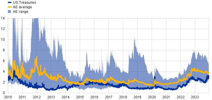 Recently, liquidity in the US Treasury market has declined owing to a combination of factors. Chart A (panel a) shows the evolution of bond market liquidity in selected advanced economies, including the US Treasury market, as measured by the “spline spread”, which is the average fitting error in a yield curve. This spread serves as a proxy for the extent of arbitrage opportunities in a bond market, with higher values being associated with lower market liquidity.[1] The smooth functioning of the US Treasury market has been challenged on a number of occasions in recent years, particularly in March 2020 at the onset of the pandemic. More recently, monetary policy tightening (including reduced absorption of US Treasuries by the Federal Reserve System, as shown by the blue line in Chart A, panel b) and elevated uncertainty about inflation and growth are likely to have contributed to declining liquidity and increased the sensitivity of US and global sovereign bond markets.[2]