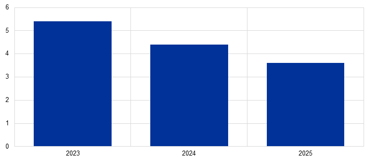 Notes: Averages of contacts’ perceptions of wage growth in their sector in 2023 and 2024 and of their expectations for 2025. The averages for 2023, 2024 and 2025 are based on indications provided by 75, 81, and 73 respondents respectively.