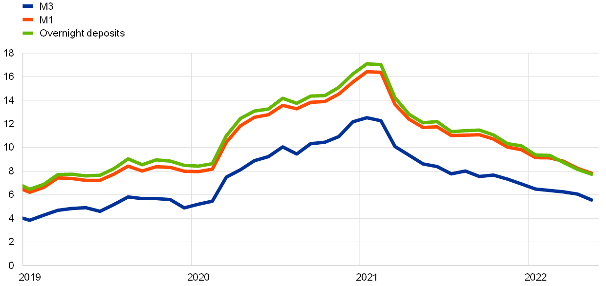 Broad money (M3) growth returned to its long-term average in May. The annual growth rate of M3 continued its downward trend in May, declining to 5.6% from 6.1% in April (Chart 19). This annual rate is in line with the average since 1999, and shorter-term dynamics point to a stronger moderation. On the components side, the main driver of M3 growth continued to be the narrow aggregate M1, largely reflecting developments in overnight deposits. On the counterparts side, credit to the private sector continued to support annual M3 growth, while the positive contribution from the Eurosystem’s purchases of government securities under the asset purchase programme and the pandemic emergency purchase programme decreased further, as these purchases are gradually being phased out. At the same time, the increase in net monetary outflows to the rest of the world dampened money growth, reflecting two main developments. First, the higher energy prices exerted a negative impact on deposit dynamics and the euro area trade balance. Second, the current uncertainty and yield differentials with several countries outside the euro area has made investing in euro area assets less attractive to global investors.