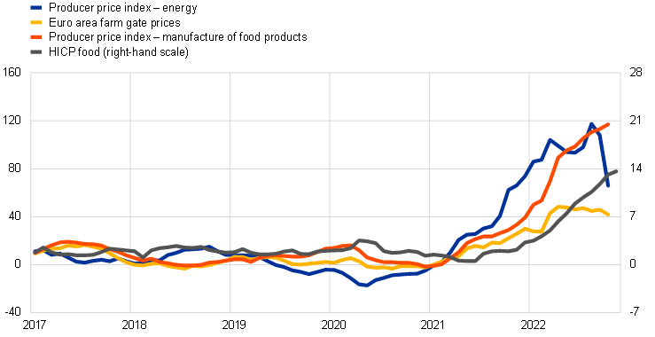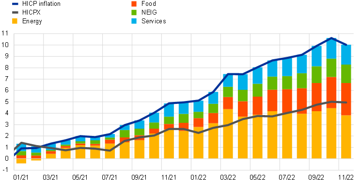 Inflation declined to 10.0% in November, mainly on the back of lower energy price inflation, while services inflation also edged down. Food price inflation rose further to 13.6%, however, as high input costs in food production were passed through to consumer prices. Price pressures remain strong across sectors, partly as a result of the impact of high energy costs throughout the economy. Inflation excluding energy and food was unchanged in November, at 5.0%, and other measures of underlying inflation are also high.