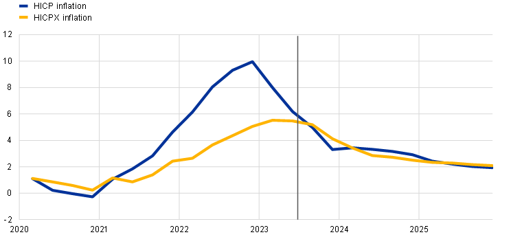 Headline inflation in the euro area is projected to continue to decline over the projection horizon owing to easing cost pressures and supply bottlenecks, as well as the impact of monetary policy tightening. HICP inflation excluding energy and food is also expected to gradually decline. However, it is projected to stand above headline inflation until early 2024. The projected disinflation is due to fading effects of the past energy price shocks and other pipeline price pressures, with strong growth in labour costs gradually becoming the dominant driver of HICP inflation excluding energy and food. Wage growth is expected to decline gradually from mid-2023, albeit remaining high over the projection horizon, driven by increases in minimum wages and inflation compensation, in a context of a tight, though cooling, labour market. Profit margins, which expanded notably last year, are expected to provide a buffer to the pass-through of labour costs to final prices in the medium term. In addition, the tighter monetary policy should increasingly dampen underlying inflation. Overall, with medium-term inflation expectations assumed to remain anchored at the ECB’s inflation target, headline HICP inflation is expected to decrease from an average of 8.4% in 2022 to 5.6% in 2023, 3.2% in 2024 and 2.1% in 2025, reaching the target in the third quarter of 2025. Compared with the June 2023 projections, HICP inflation has been revised up for 2023 and 2024, driven by higher energy futures prices, and down for 2025, as the impacts from the appreciation of the euro, tighter financing conditions and weaker cyclical conditions are seen to dampen HICP inflation excluding energy and food.