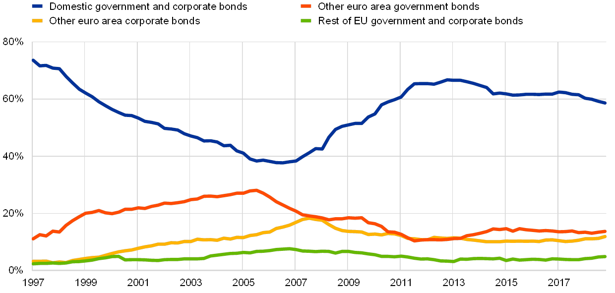 The introduction of an adequately designed common sovereign safe asset could have important benefits for financial stability, integration and development in the euro area. The euro area financial structure currently lacks a common sovereign safe asset. Such a security would develop the financial system by introducing an additional financial instrument with risk/return characteristics that are different from those of existing assets, notably with low risk that is not directly related to a single sovereign. Moreover, such a debt security could be an important ingredient for developing a proper euro area term structure, a key feature of highly developed capital markets based on which many other financial instruments would be priced. Both of these benefits have natural implications for financial integration, not only for the cross-country convergence of asset prices and interest rates, but also for investor diversification beyond domestic assets. But one of the most emphasised effects of a well-designed euro area sovereign safe asset is the potential benefit for financial stability. Notably, significant home biases in banks’ government bond holdings leave important channels of the sovereign-bank nexus still intact, despite major progress with the first two pillars of the banking union. The option to diversify sovereign holdings by also investing in a common safe asset would reduce the scope for direct losses from national fiscal sustainability issues. Furthermore, reducing the relevance of national sovereign benchmark bonds could weaken the link between debt sustainability of the domestic sovereign and bank funding costs (including via high-quality liquid collateral for repurchase agreements). Moreover, as both a common safe asset and changes to the regulatory treatment of banks’ sovereign exposures are part of the European policy debate, indicative simulations in Box 1 of Special Feature B suggest that combining regulatory sovereign concentration charges (i.e. higher capital requirements for banks with more concentrated sovereign debt portfolios) with a safe asset could facilitate the reduction of the home bias, imply a smaller need for reshuffling sovereign holdings above the concentration threshold, and could avoid potential increases in the volatility of banks’ sovereign bond portfolios. While introducing a common safe asset and changing the regulatory treatment of sovereign exposures could be two mutually supporting elements of EMU deepening, discussions on these possible measures should be viewed in the broader context of completing the banking and capital markets unions, which includes the ongoing policy debate on a European deposit insurance scheme.