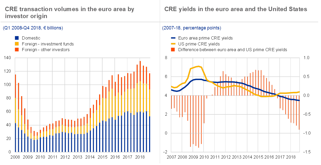 Developments in euro area property markets warrant monitoring in a prolonged low interest rate environment. Buttressed by the low interest rate environment, the euro area residential real estate sector continued its gradual expansion. The recently issued ESRB warnings and recommendations with regard to residential real estate vulnerabilities suggest that continued strong price dynamics, coupled with relatively buoyant mortgage lending growth and high household indebtedness, represent key vulnerabilities in a number of countries (see Chart 6, right panel). Alongside decreasing transaction volumes, commercial real estate price growth has shown signs of slowing, indicating that the commercial real estate cycle may be turning. Valuations also seem stretched following a strong upswing, supported by the search for yield by foreign investors, in particular US investment funds. Being more sensitive to changes in global financial conditions, foreign investors might make domestic commercial real estate markets more exposed to a sharp or disorderly adjustment (see Box 1).