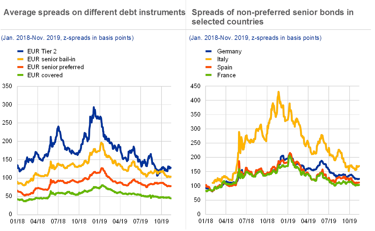 Notes: Right panel: Financial sector bonds comprise mainly bonds issued by banks, including straight bonds, euro medium-term notes and Pfandbriefe, as well as other instruments such as asset-backed securities, medium-term notes and money market instruments.