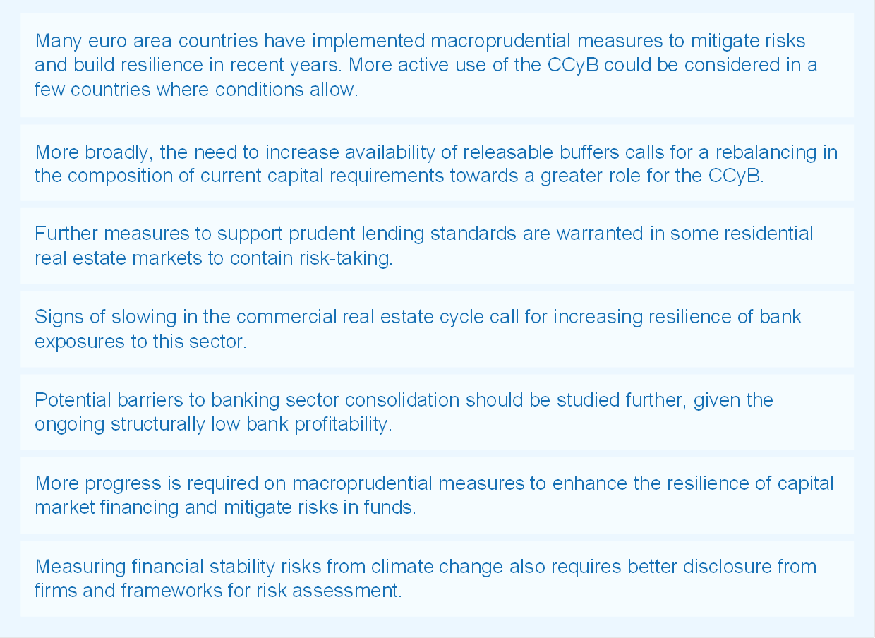The activation or further increase of releasable countercyclical capital buffers seems merited in a few countries. Seven euro area countries have announced a positive countercyclical capital buffer (CCyB) rate, with rates ranging from 0.25% to 2% (see Chapter 5). There is a case for a few other countries with solid credit growth, increasing debt levels and signs of an underpricing of risks to consider activating the CCyB. In general, a greater availability of a releasable buffer in the form of a CCyB would be useful in the euro area. Unlike structural capital requirements, the CCyB can be released in a downturn and can provide banks with room to avoid the excessive deleveraging that turns a stress episode into a crisis. This would call for a rebalancing of the current capital requirements towards a more prominent role for the CCyB.