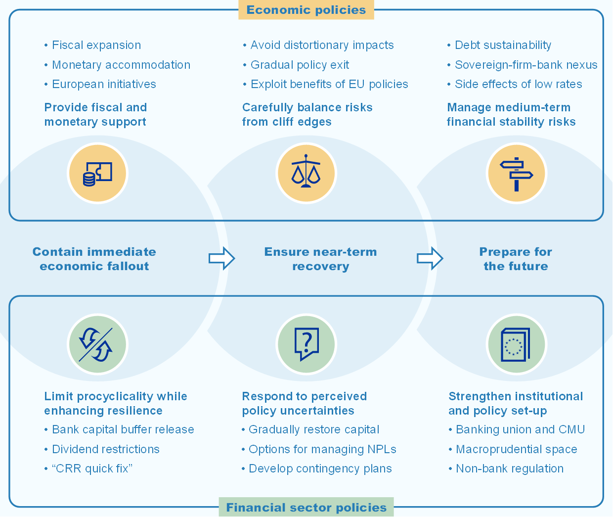 Near-term actions need to be accompanied by policy planning for medium-to-long-term risks. While policymakers focus mostly on addressing the immediate situation, attention also needs to be paid to a number of risks that could arise further ahead. First, in the face of an uneven recovery, integrated and resilient markets could be supported by completing the banking union and achieving progress in establishing the capital markets union (CMU), including enhancing the regulatory framework for non-banks in a way which reflects macroprudential perspectives (see Figure 1). Second, while facilitating the financing of the transition to a carbon-neutral economy offers opportunities for financial integration and growth, the financial stability risks posed by climate change must be managed. Finally, the experience of recent months shows the benefits of releasable bank capital and suggests rebalancing capital requirements to create macroprudential policy space in the medium term.