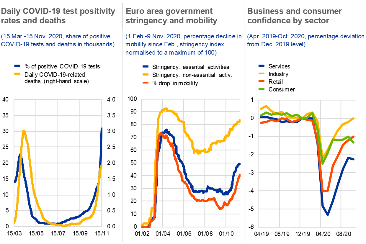 The resurgence of coronavirus cases in autumn dampened the economic recovery as governments reintroduced tighter albeit more targeted restrictions. As new cases declined in late spring, authorities began to ease the strict social distancing measures that had aimed to control the initial spread of the virus (see Chart 1.1, left and middle panels). At the same time, the major fiscal and monetary policy measures had started to take effect, which supported a sharp rebound in economic activity and business confidence over the summer (see Chart 1.1, right panel). Although the resurgence of infections since August has triggered a renewed tightening of restrictions, these have become more targeted (see Chart 1.1, middle panel), thereby limiting their overall economic impact somewhat. Nonetheless, there have already been signs of weaker business confidence and economic activity (see Chart 1.1, right panel).