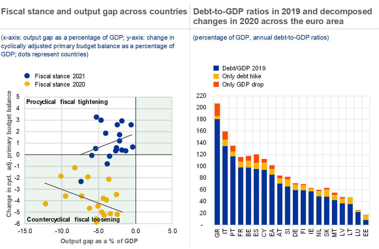 Notes: Left panel: fiscal stance is defined as the change in the cyclically adjusted primary budget balance. Right panel: Data for 2020 on debt and GDP based on European Commission Autumn forecast. The decomposition assumes that only nominal debt or only nominal GDP changed between 2019 and 2020, affecting debt-to-GDP ratios through the numerator and denominator respectively. The interaction effect between changes in the numerator and denominator, which is positive due to the negative co-movement of debt and GDP, is attributed to GDP but of second-order importance quantitatively.