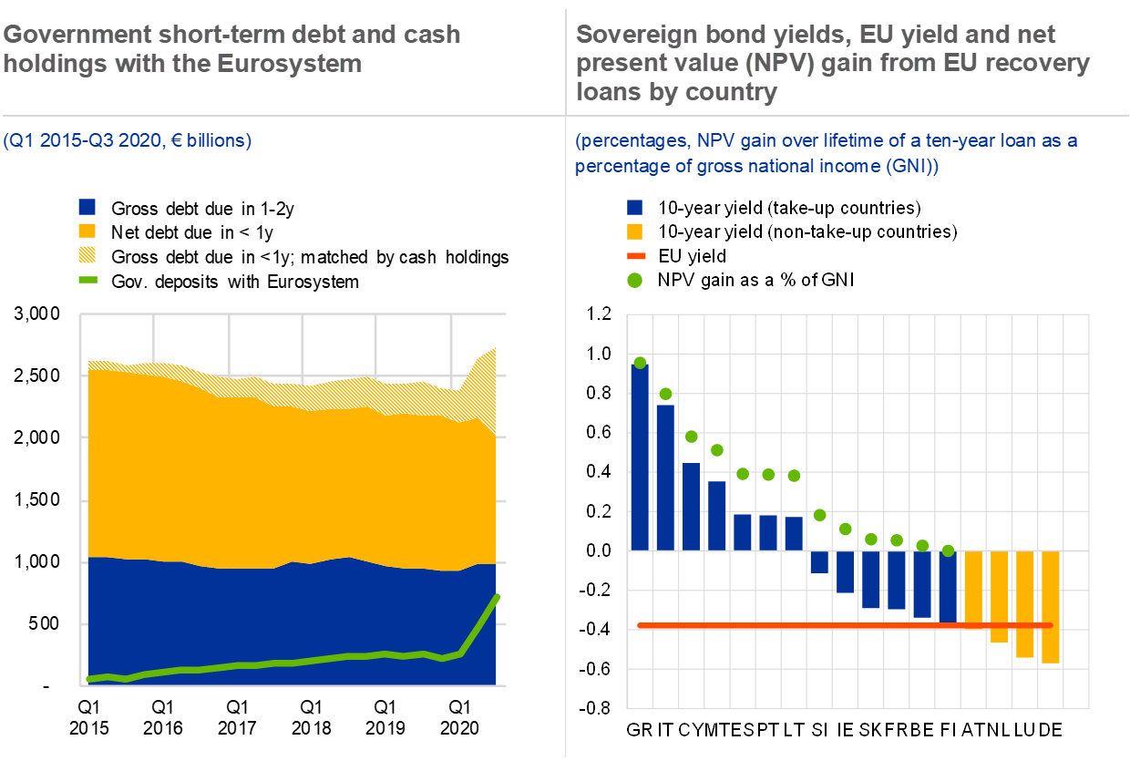 Cash buffers alleviate short-term debt service needs, while the EU recovery package supports in particular countries most affected by the crisis and with high bond yields