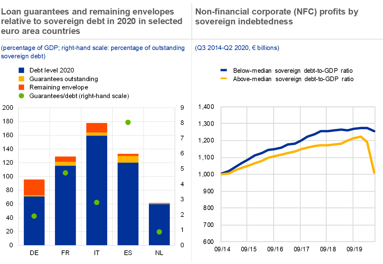 Vulnerabilities in the sovereign and corporate sectors could test euro area banks in the future. Euro area banks have significantly increased their lending to non-financial corporations during the pandemic. Guarantees and moratoria appear to have lengthened the time it takes for weak economic performance to translate into credit losses and non-performing loans (NPLs). However, higher volumes of lending to corporates could imply additional credit risk exposures, especially for banks in countries with a high legacy stock of corporate NPLs (see Chart 8, left panel). Guarantees and moratoria may harbour the risk of forbearance going forward. At the same time, banks in some countries have increased their domestic sovereign debt holdings, triggering concerns that the sovereign-bank nexus could re-emerge (see Box 4). Vulnerabilities intensifying in one sector could spill over to other sectors, leading to an adverse sovereign-corporate-bank feedback loop as well.